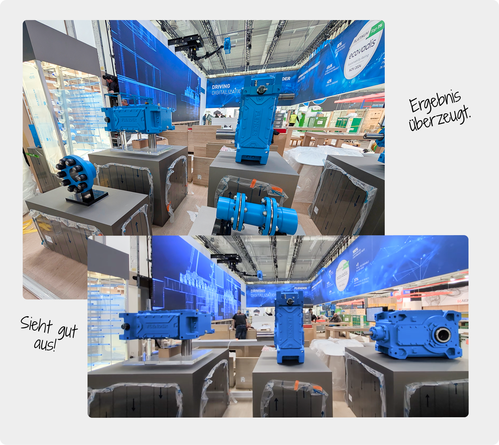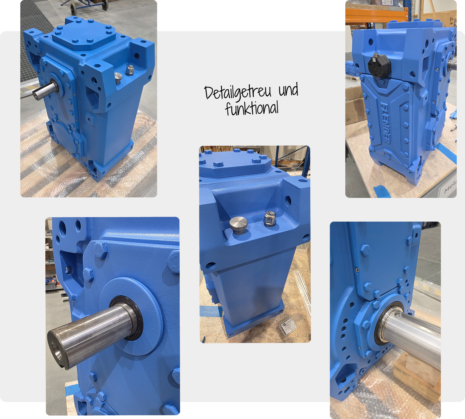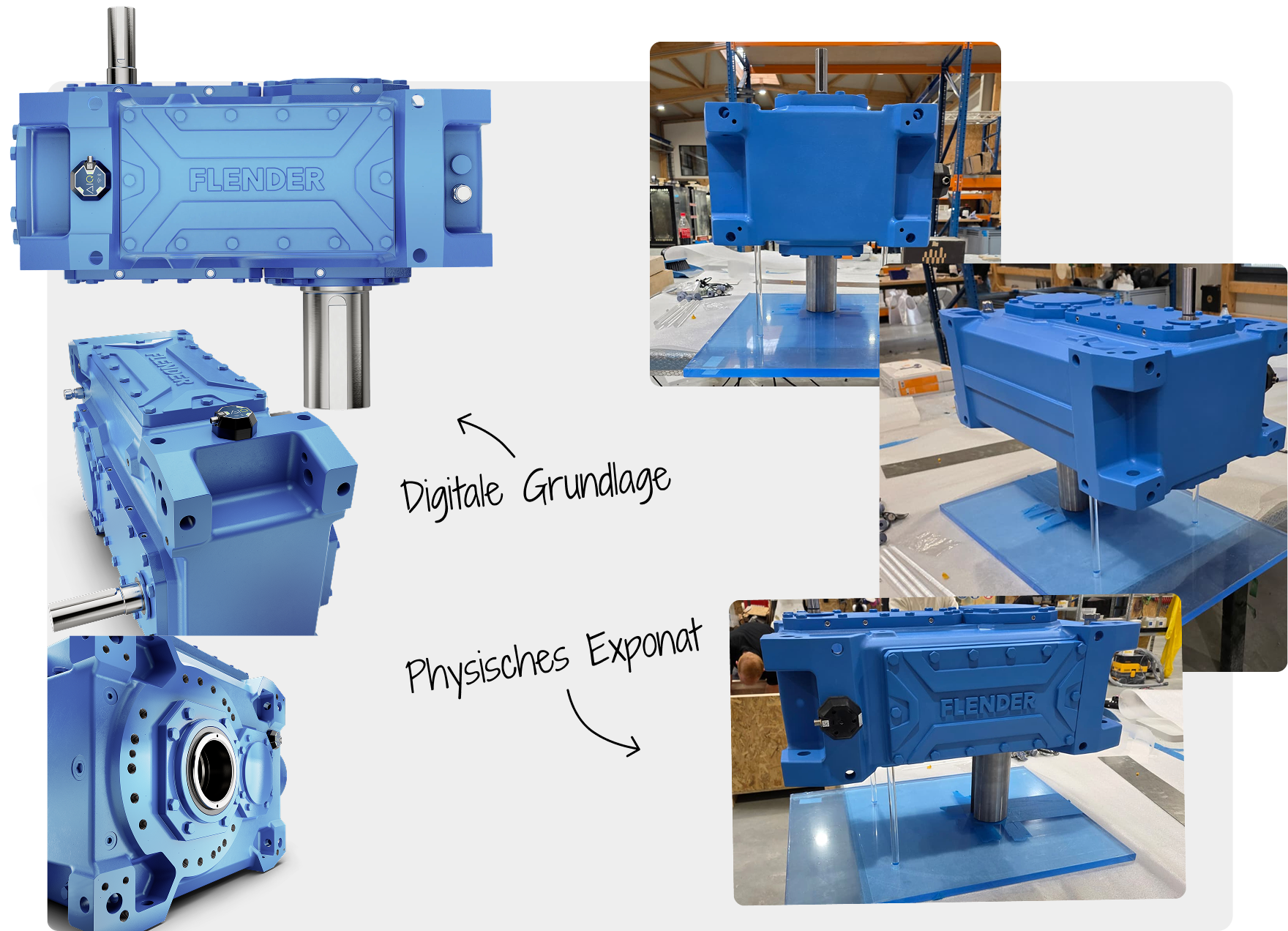 Für Flender haben wir zwei Getriebe als großformatige 3D-Druck-Exponate für den Inneneinsatz gefertigt. Dabei ging es nicht um vereinfachte Schaustücke, sondern um möglichst originalgetreue Messemodelle mit hoher Wiedererkennbarkeit und technischer Aussagekraft. Jedes Rad, jede Welle und jede Kontur orientierte sich am Original, allerdings in einer Form, die ohne Hebebühne und ohne Schwerlastlogistik bewegt werden kann.