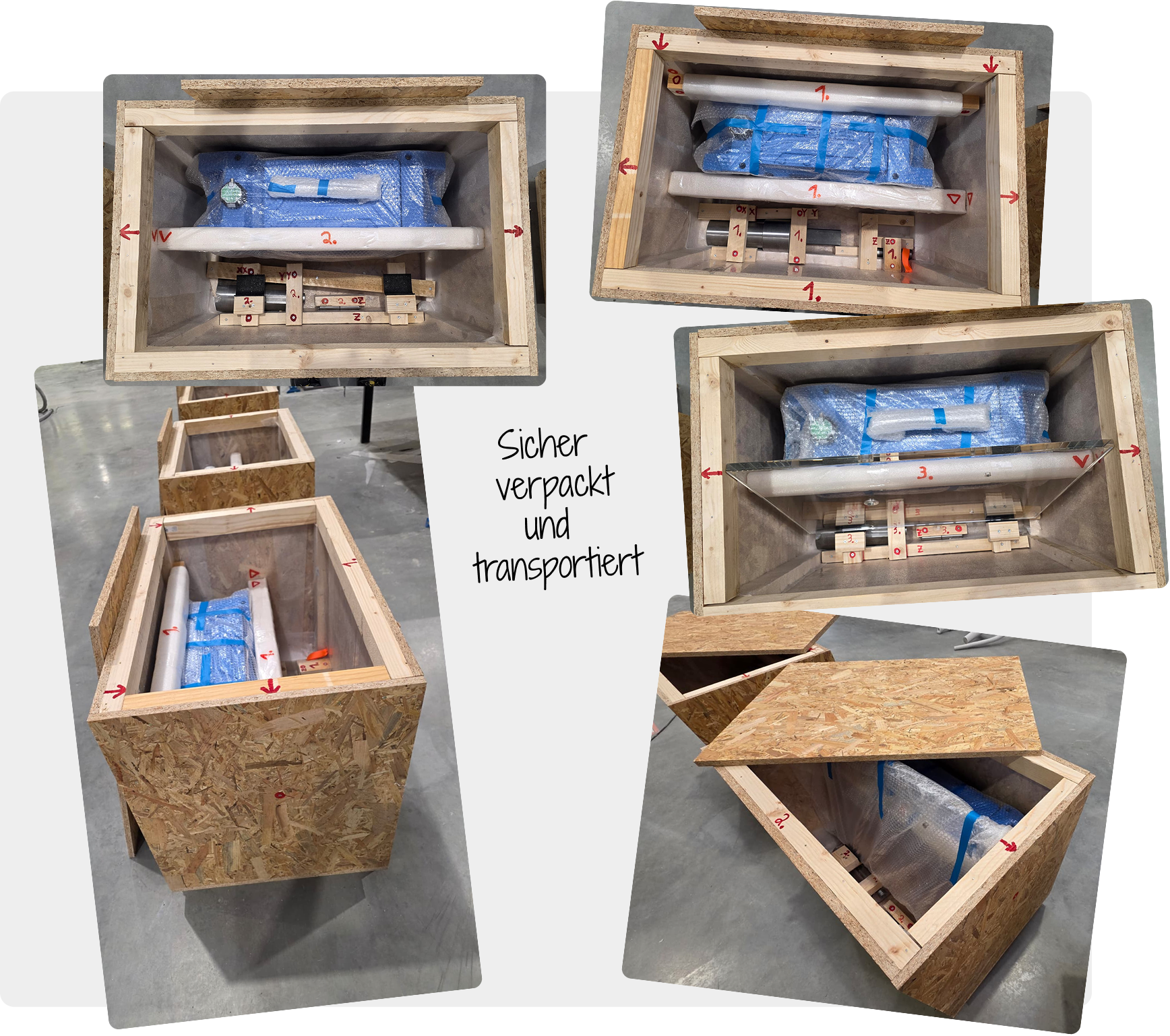 Damit die 3D-gedruckten Messeexponate auch beim Versand und bei der Einlagerung optimal geschützt sind, wurde außerdem eine Transportkiste aus etwa 18 mm starken OSB-Platten gefertigt. Sie dient dem sicheren Transport und der geschützten Lagerung zwischen den Einsätzen.