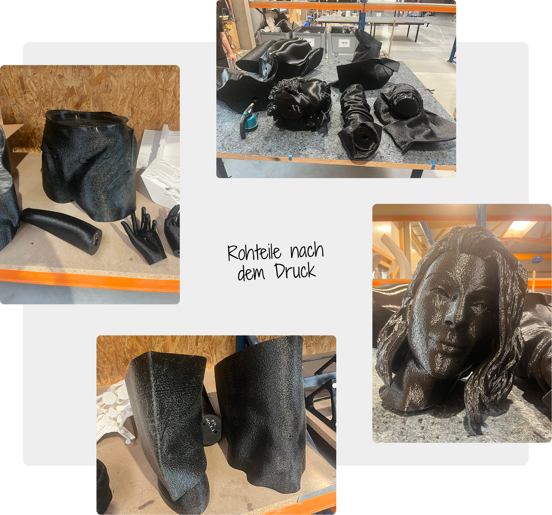 The production was carried out using large-format plastic 3D printing in PETG. A statue was produced with a height of around 370 cm, measured from the bottom of the foot to the top of the head.