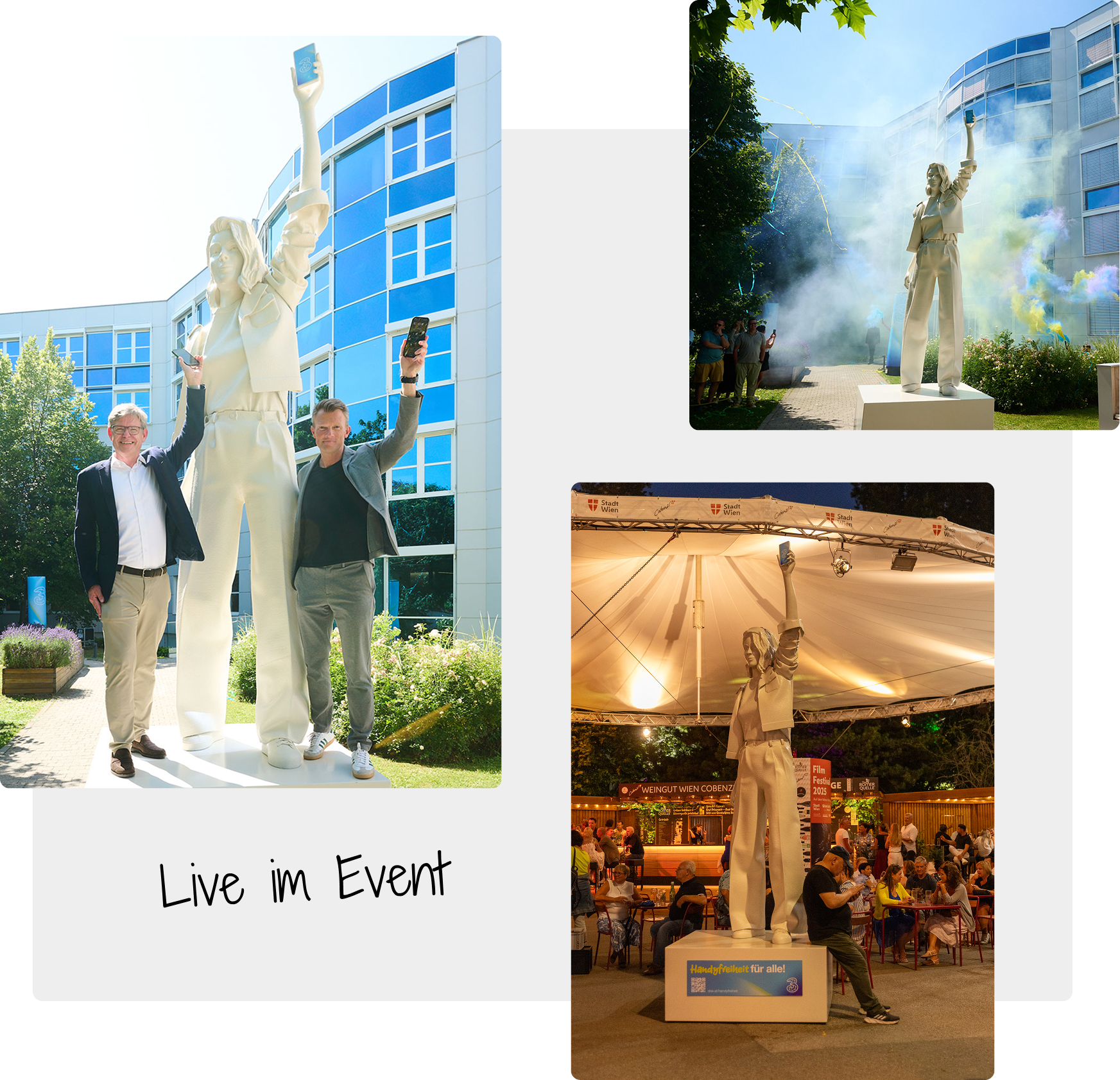 For an established event agency from Austria, which creates creative live experiences for brands — from corporate events to conferences to public events and promotions in public spaces — we were able to create an eye-catching custom-made product in large format: a huge statue for an Austrian mobile phone provider. The highlight: a monumental female figure with outstretched arms holding an illuminated smartphone. Modern, presentable and designed in such a way that it is not only visually impressive outdoors, but also remains practical.